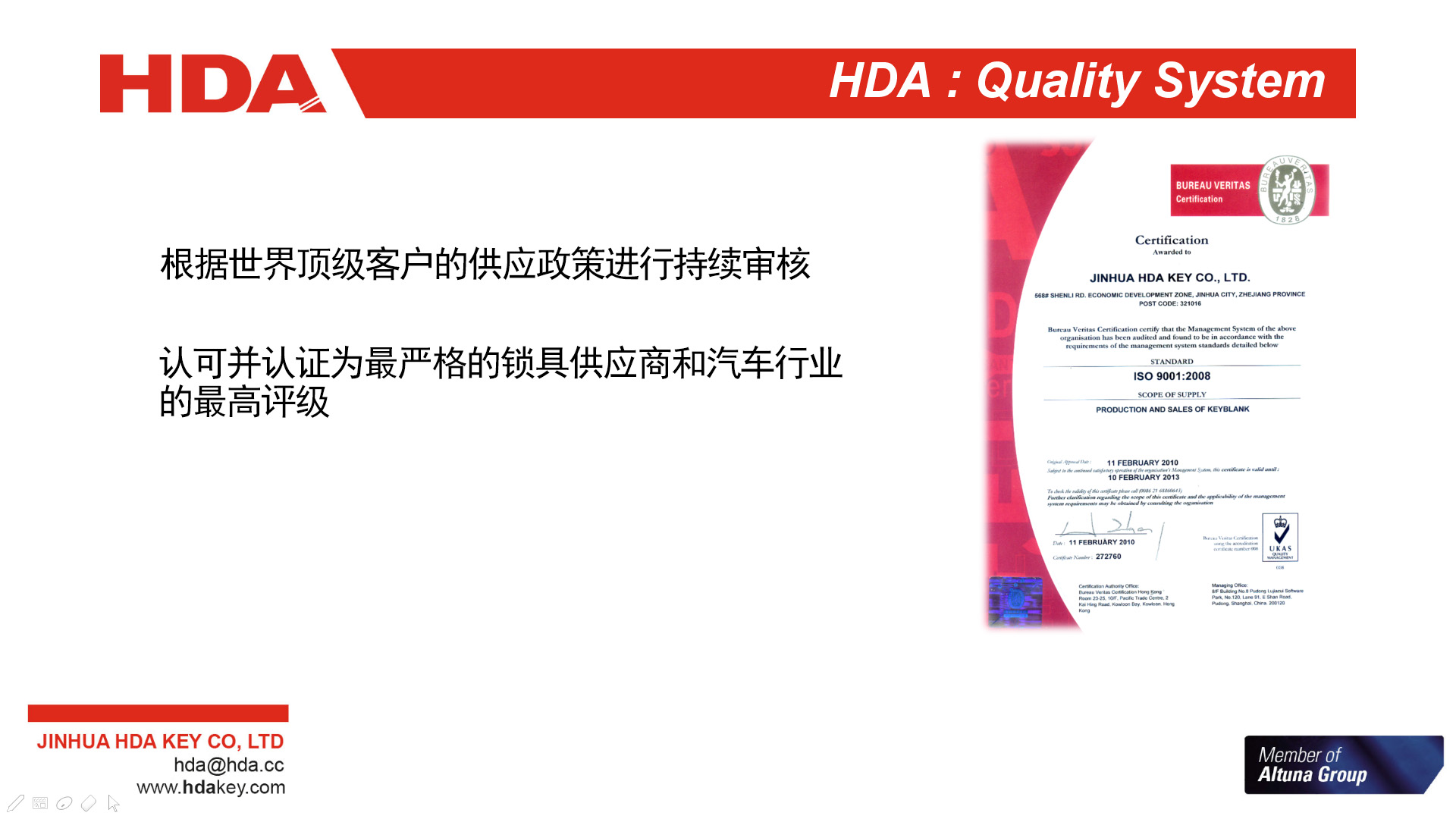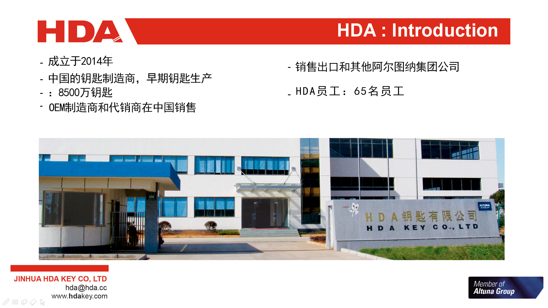 2005年,與歐洲三大鑰匙坯生產(chǎn)企業(yè)之一的西班牙JMA集團(tuán)成立合資公司--金華HDA鑰匙有限公司。 2007年,轉(zhuǎn)為西班牙JMA集團(tuán)獨資子公司。